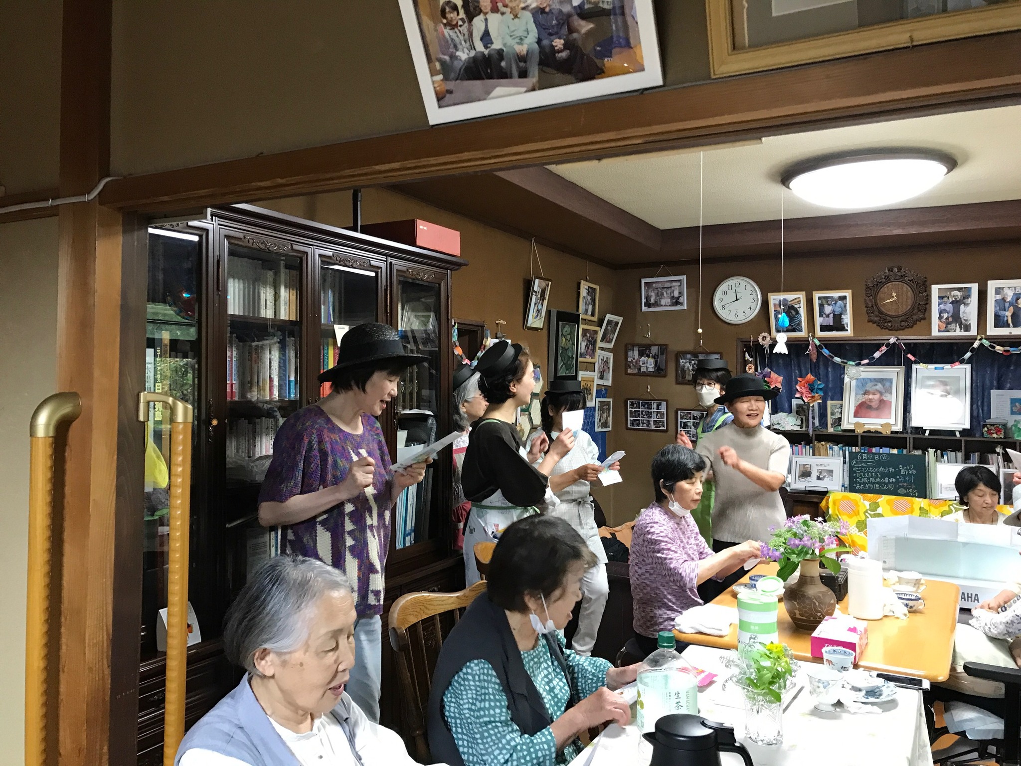 梅雨で外気が湿っているせいなのか、パン生地の発酵が遅れてしまい、パンが焼けるのが待ち遠しかったです。やっとパンが焼けておやつの時間です。半分に切ったかわいいパンに、餡子、バター、ハチミツ、卵マヨネーズ和え等を利用者さんがそれぞれ挟んで出来上がりです。焼きたてのパンは美味しく、中に挟んで食べるともっと美味しかったです。待った甲斐がありました (๑˃̵ᴗ˂̵)最後はピンキーとキラーズの「恋の季節」をみんなで歌いました。スタッフさん達が黒い帽子をかぶって、ピンキーとキラーズ役に扮して、振りも真似ました。キラーズの帽子は紙でスタッフさんが作成した優れモノです。結構盛り上がったので、もう一回歌っちゃいました(╹◡╹)