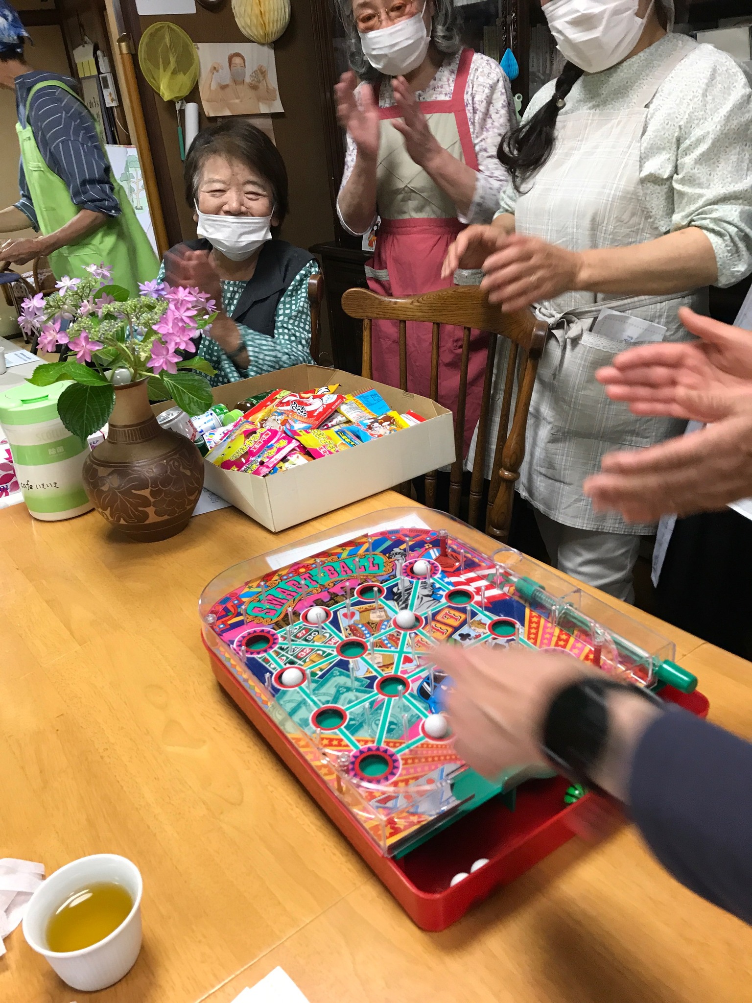 【6月15日のカフェ】今日は朝早くからスタッフさん達がパン生地を小さく丸める作業をしていました。さてこれから成形されたパン生地の発酵を待ちます。まずはスマートボールという玩具で遊びます。スマートボールというのは、レバーを引く力加減でうまく球を並べて、たて・横・斜めのいずれか1 列の穴に玉が4つ並べばビンゴが1 つ完成です。景品としてお好きな駄菓子がもらえます。レバーを引く力が強かったりして、なかなか穴に入らなかったりしますが、2列ビンゴを完成され、2個の景品をゲットされた方もおられました^o^続いてソングの時間です。「しゃぼん玉」から「夏は来ぬ」まで4曲歌い、輪唱は「かえるのうた」です。今回はバッチリ上手くいきました (^^)v
