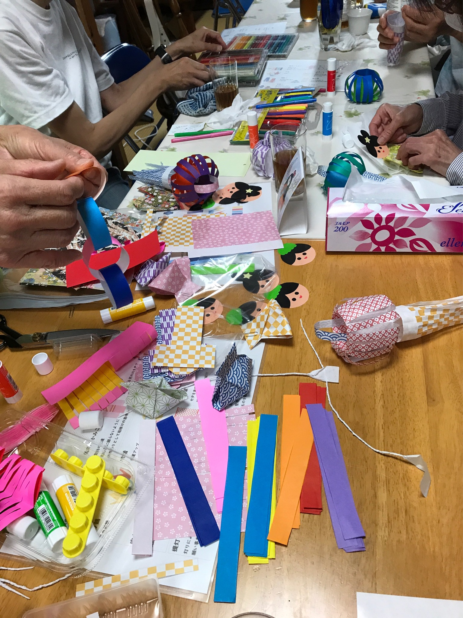 【7月20日のカフェ】毎年夏の気温は高い方に更新されていますが、今年の京都は猛暑続きで、連日熱中症警戒アラートが出ています。猛暑のせいか、いつも来られる利用者さんは少なめでしたが、日本語学校で学んでいる、メキシコや台湾からの女子留学生3名が参加されました。七夕の日が過ぎてからのカフェですが、今年も利用者さんから黒竹を頂きました。まずは皆さん、短冊に願いごとを書かれます。昨年に引き続き世界平和への願いがありました。早く和平が成立しますようにと願うばかりです。留学生達の短冊には、「日本語が上手欲しい!(原文ママ)」「日本語がペラペラ欲しい!(原文ママ)」と、日本語の上達を願っておられます。(^.^)続いて七夕飾りを作ります。お姫様、提灯、吹き流し、金運を招く巾着、厄除けの紙衣、人のつながりも意味する輪つなぎ等です。スタッフが事前に作りやすいように折り紙を切って準備されていたので、皆さんは糊やハサミを使って楽しんで作っていかれました。次は歌の時間です。「海」「たなばたさま」などの季節の歌を歌い、アンパンマンの作者 やなせたかし作詞の「手のひらを太陽に」を歌うと元気が出てきました。やなせの詩にはアメンボ、カエル、ミツバチなどの生き物が出てきます。歌詞プリントにはその生き物の絵が印刷されていて、留学生達が生き物の名前と絵を見比べて学習している姿は、何とも微笑ましかったです。輪唱は「きらきらぼし」です。この曲はフランス民謡だから、留学生達はメロディをよく知っていたので、日本語の歌詞を頑張って歌われてました()vおやつは朝早くからスタッフ達が焼かれた、お手製クッキーをメインに、バニラアイス、コーヒーゼリー又は水羊羹の豪華版でした。クッキーはレモンとホワイトチョコのスノーボールとハートや星の型抜きクッキーです。美味しくて大満足でした♡(^^)