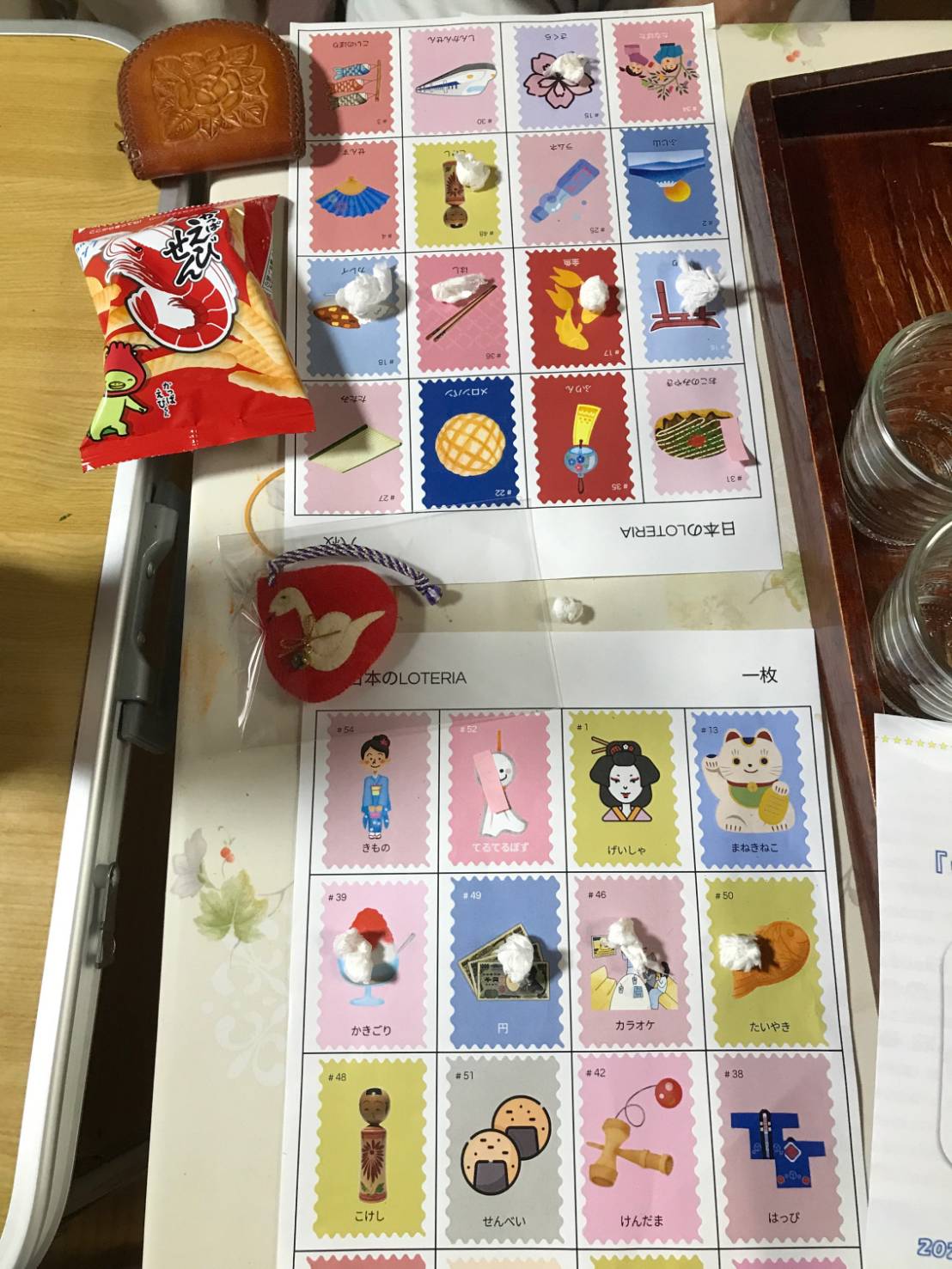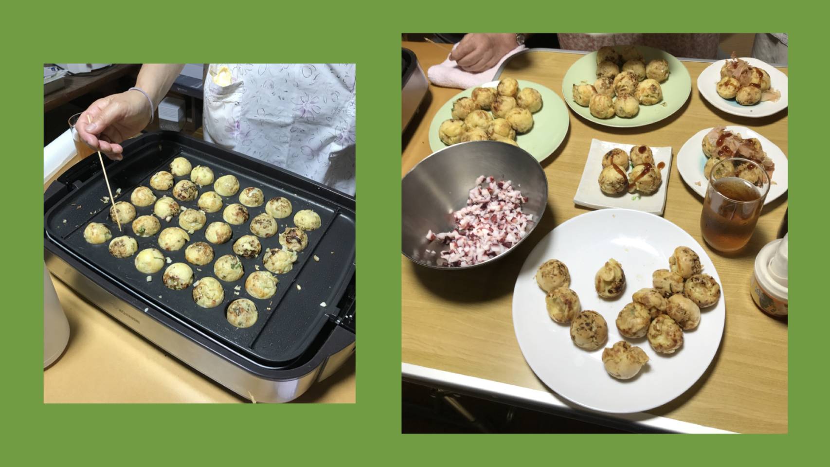 【8月24日のカフェ】お盆を過ぎても猛暑は続いていますが、皆さんお変わりなく参加されてホッとしました。今回も日本語学校の留学生5名が参加されました。テーマは夏祭りということで、まず皆さんの前でたこ焼きを焼きはじめます。通常のタコ入りと鳥ミンチ生姜風味の2種類です。初お目見えの鳥ミンチ味は新鮮で美味しかったです。続いて綿菓子作りも始まりました。台湾の留学生さん達が飛び入りで上手に綿菓子を作って下さいました。次はメキシコの留学生主催のゲームの時間です。これは「ロテリア(Lotería)」というメキシコのゲームで、ハンバーガー店の「ロッテリア」とは関係ありません。ロテリアは、日本のビンゴゲームと似ていますが、数字ではなく絵柄を使います。留学生さんは日本バージョンを作成されました。日本関連の絵柄、例えば富士山、着物、桜、鳥居、こけし等の絵が数十種類、切手の絵柄として16枚印刷されている用紙を皆さんに配ります。進行役である留学生さんが絵柄カードを読み上げて見せ、皆さんは配られた用紙に同じ絵柄があれば、豆などを置いてマークしていきます。縦・横・斜めのいずれかの列が揃ったら「ロテリア!」と叫んでゲームオーバー、景品(手作り小物や菓子類)を選んで貰えます。最終結果は4人が「ロテリア」を達成し、その内のお一人は2回も達成されました。絵柄が色彩豊かで可愛いかったです。皆さん結構夢中になって楽しまれていました。留学生さん達はこのゲームをしながら、日本文化の言葉を覚えていかれるのかもしれませんね (^o^)続いてのソングは、「我は海の子」「ピクニック」など4曲に続き、輪唱は「森のくまさん」で、速いテンポの曲なのに上手く揃いました。最後の「黒猫のタンゴ」は利用者さんが帽子をかぶったり、可愛いカチューシャを付けて前に出て頂き、みんなで楽しんで歌いました (^-^)v
