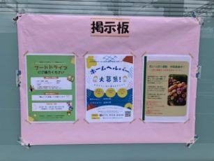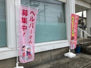 訪問介護と居宅介護支援の事業所であることが地域の方々にも理解してもらえるよう、道路側のガラス面に「京都福祉サービス協会」の文字をカッティングシートで貼り付け、事務所外にヘルパー募集の立て看板(ヘルパーが書きました!)と旗、取り組み内容をお伝えする掲示板を設置しました。